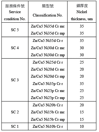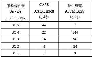 按這種規格的電鍍的鋅合金可以附合服務條件SC5。下表是各種服務條件SC的銅加速酸性鹽霧(CASS) ASTM B368標準和酸性鹽霧ASTM B287標準要求: